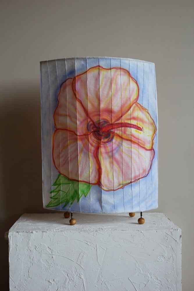 STORY & MATERIALS / The frame for this paper lamp was purchased as a set of 3 from a lovely lady in Auckland who said she collected too much stuff and was having a clear out. The other two, Ruby and Brooklyn sold in previous collections. It was re-wrapped with paper from Kozo Studio in Thailand. It was put together in our Mangawhai studio and then painted by Ryder Jones using his airbrush.